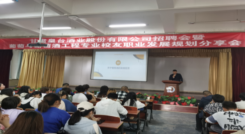 会上,甘肃凉州葡萄酒有限公司总经理潘涛为师生介绍了公司的基本情况及发展规划,对中国葡萄酒的发展前景、葡萄酒的生产工艺等进行了详佃介绍,人力资源部部长杨丽萍为毕业生介绍了公司的发展概况、岗位需求、员工培养模式等,希望同学们积极应聘。