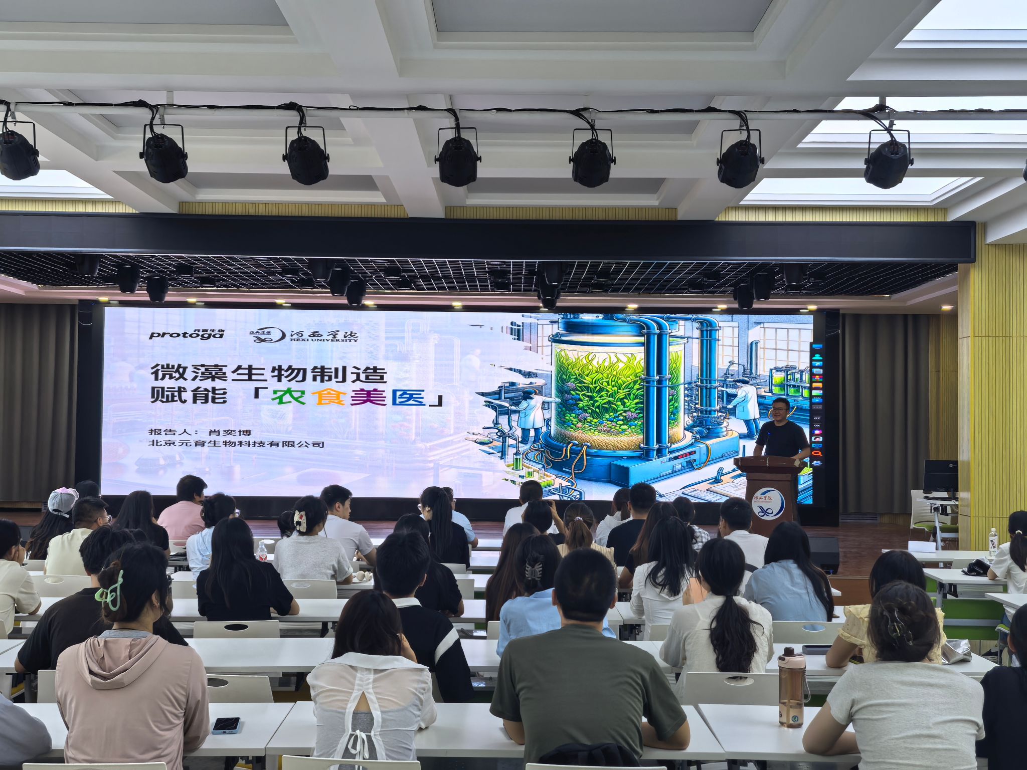 在报告中,肖奕博博士详细介绍了微藻生物制造的原理与技术路径,阐述了微藻作为一种高效生物资源在农业、食品、美容和医疗等领域的巨大应用潜力。他指出,微藻富含多种生物活性物质,通过现代生物工程技术,可以将其转化为高附加值的产品,为相关产业带来创新动力。同时,肖博士结合自身创业经历,分享了他在创业过程中历经的艰辛与挑战。从技术研发的瓶颈到市场开拓的艰难,从资金短缺的困境到团队建设的挑战,他坦诚地分享了每一个艰难时刻的应对策略。他鼓励在场的学生要有敢于冒险的精神和坚韧不拔的毅力,勇于追求自己的创业梦想。报告结束后,肖奕博博士还与现场师生进行了互动交流,解答了大家关于微藻生物制造技术、创业策略以及未来发展趋势等方面的问题。