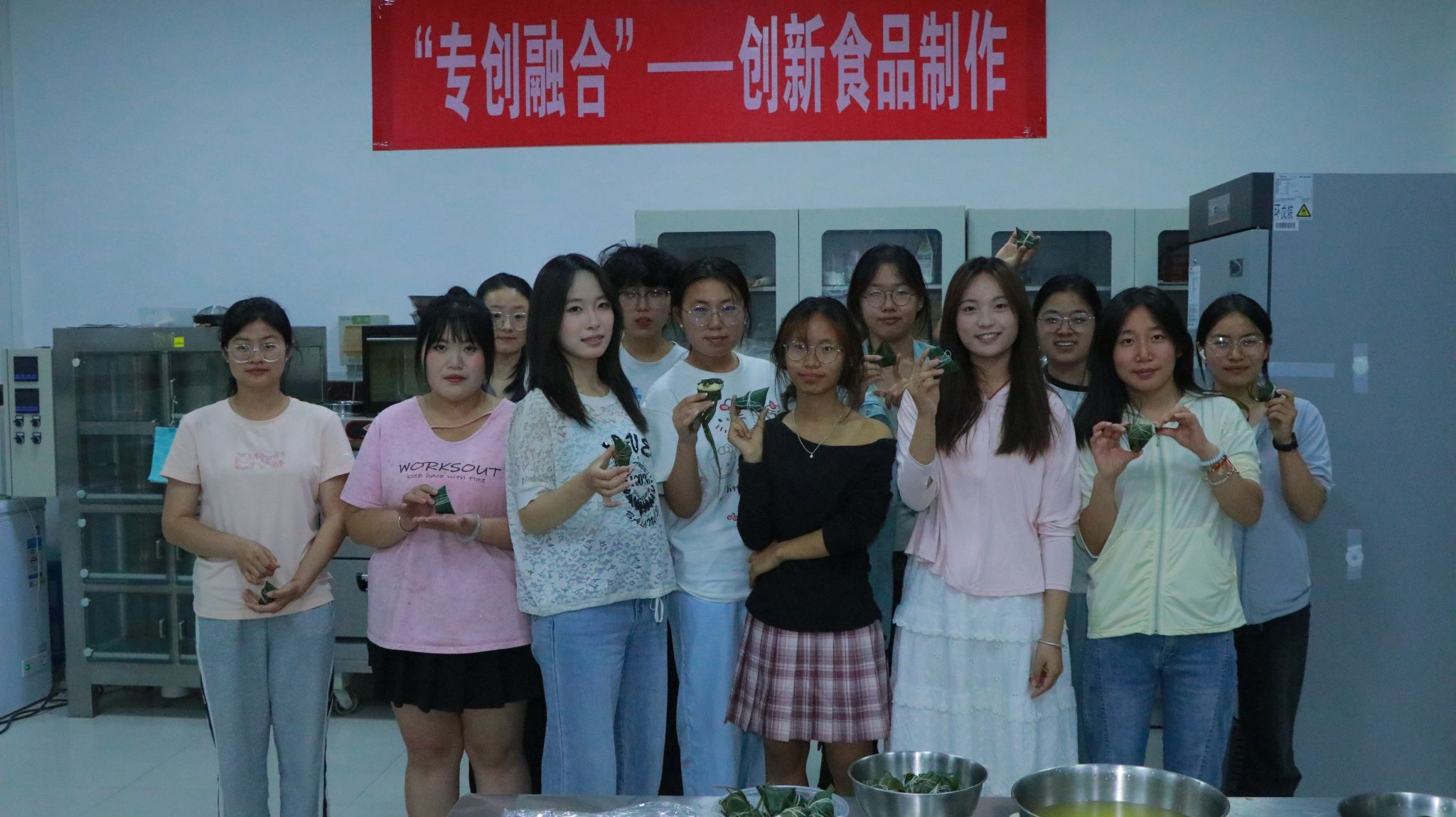活动以屈原投江的历史典故为引,师生们深入了解了端午节的文化意蕴、粽子的制作渊源以及端午“驱疫避毒”的原始内涵。实验室内,糯米、粽叶、红枣、豆沙等材料整齐摆放,粽叶的清香弥漫在空气中。专业老师现场指导,从选叶、折叶、填料到缠线,详细演示了传统四角粽的包制技巧。同学们围坐一堂,边学边做,实验室瞬间变成“手工课堂”。大家分工明确,互相协作,有的调馅,有的填充,有的缠线。经过共同努力,百余个形态各异的粽子新鲜出炉。